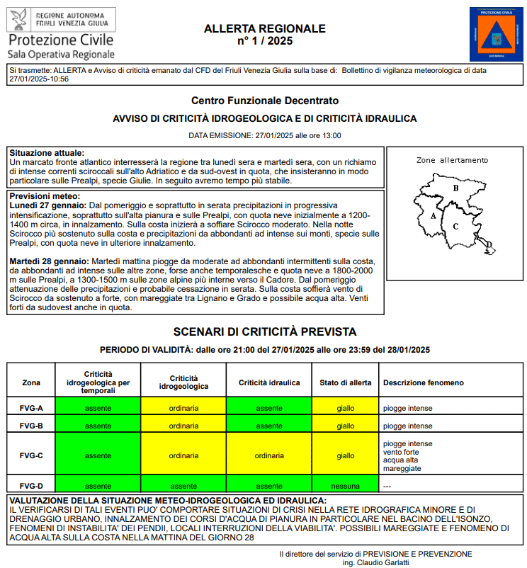 Il Centro Funzionale Decentrato (CFD) della Regione Friuli Venezia Giulia ha emesso un avviso per allerta idrogeologica e idraulica in seguito all’avvicinarsi di un forte fronte atlantico, previsto per la serata del lunedì 27 gennaio e che interesserà la regione fino alla sera del martedì 28 gennaio 2025. Questo evento meteo potrebbe avere impatti significativi sul territorio, in particolare nelle aree montuose e costiere, con piogge intense, forti venti e un rischio di mareggiate e acqua alta.