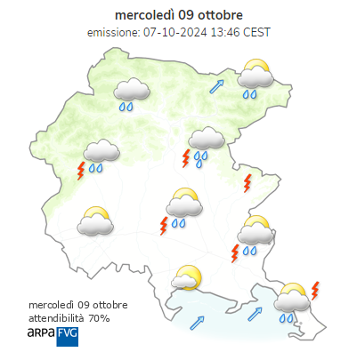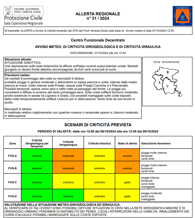 Il Centro Funzionale Decentrato (CFD) della Protezione Civile del Friuli Venezia Giulia ha diramato un'importante allerta regionale n° 31/2024 in seguito alle previsioni meteo di data 7 ottobre 2024....