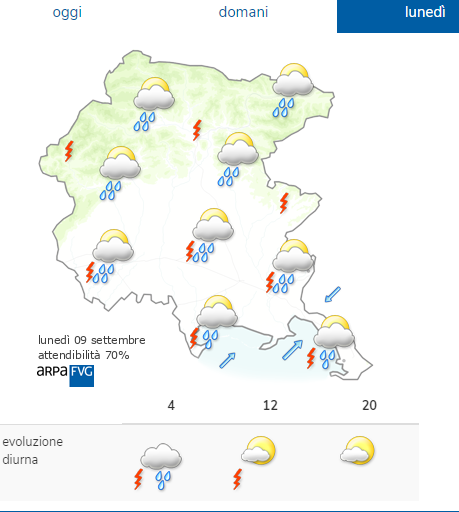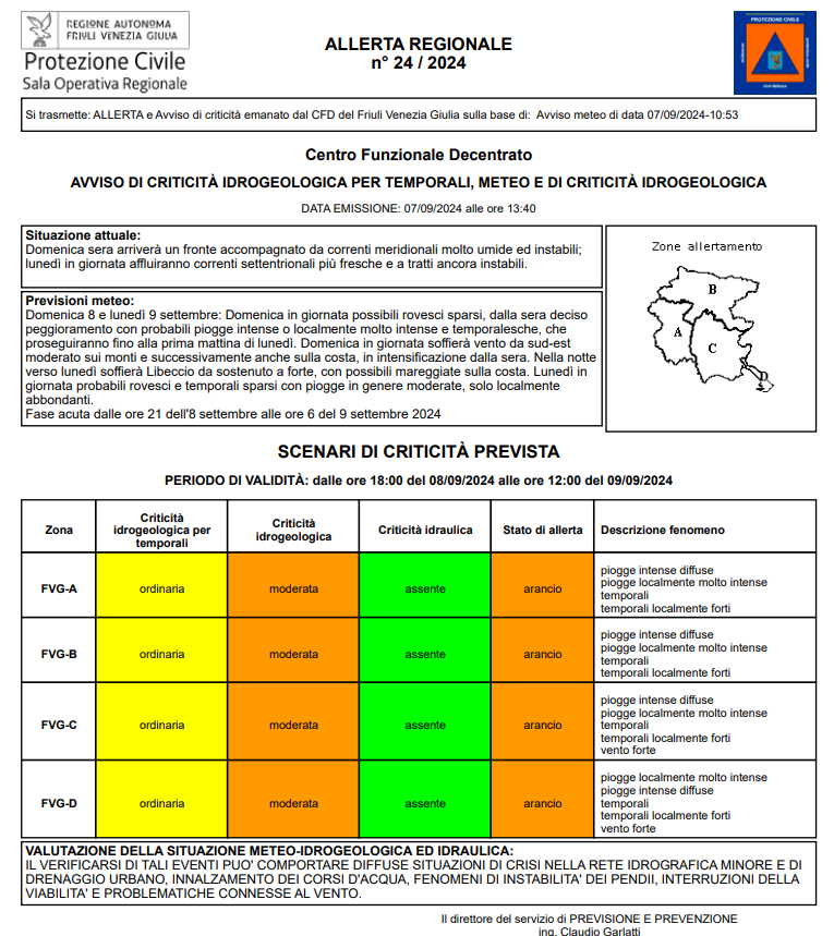 È stato emesso un avviso di allerta meteo arancione per la regione Friuli Venezia Giulia, con previsioni che indicano un peggioramento delle condizioni atmosferiche a partire da domenica 8 settembre 2024, estendendosi fino alla mattinata di lunedì 9 settembre. Il bollettino, diffuso dal Centro Funzionale Decentrato (CFD) della Protezione Civile, segnala la possibilità di temporali forti, piogge molto intense e forti venti, specialmente nelle zone costiere.