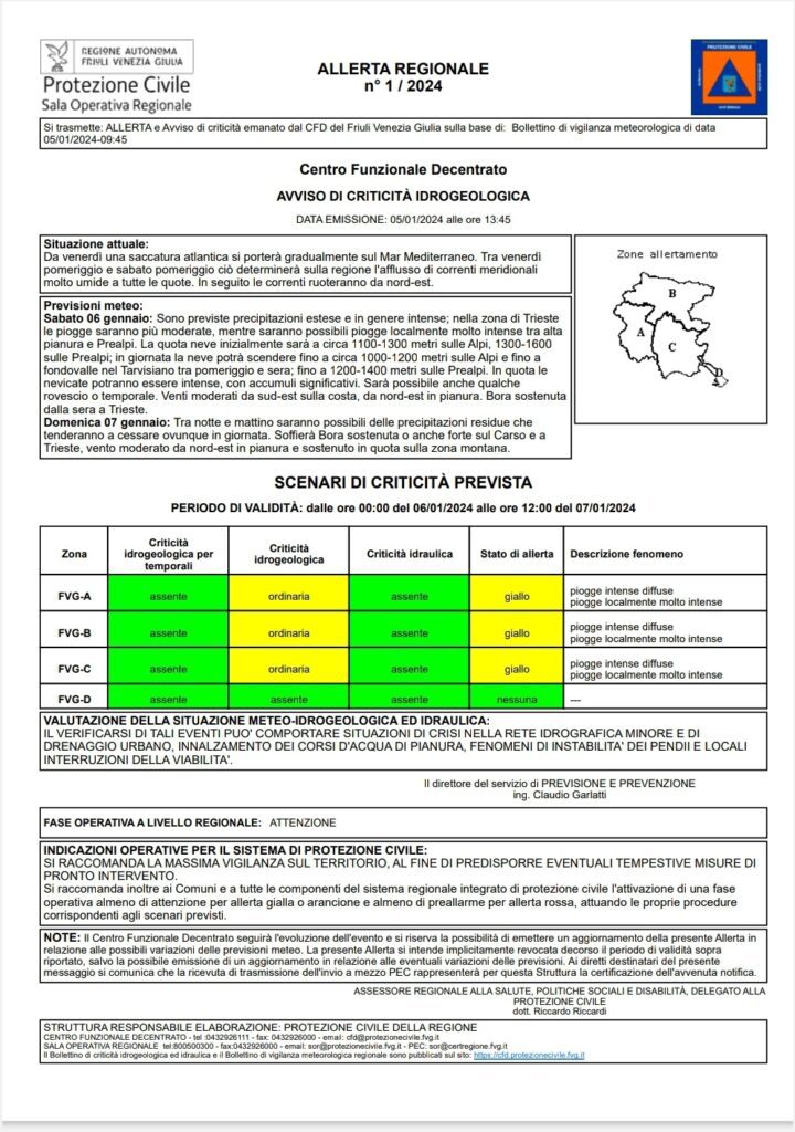 La protezione civile della regione Friuli Venezia Giulia ci mette in guardia con l'allerta meteo gialla numero 1 del 2024. L'allerta sarà valida dalla mezzanotte di sabato 6 gennaio alle 12:00 di domenica 7 gennaio, con particolare attenzione alla criticità idrogeologica sulle zone FVG-A, B e C.