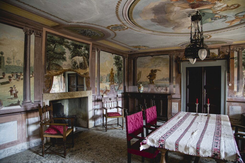 - La sala da pranzo: affrescata dal pittore Andrea Urbani, che ha creato un ambiente ricco di dettagli e colori.