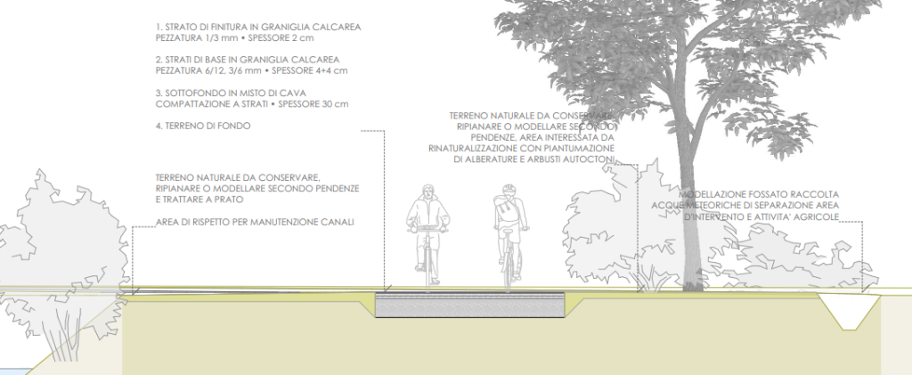 Questo intervento - continua il vicesindaco – ha l’obiettivo di realizzare un nuovo percorso ciclo-pedonale sulla sponda sinistra del fiume Fiume, per collegare il ponte con la zona est del capoluogo, all’altezza di via Sacconi. Il progetto riguarda il recupero dei “paesaggi dell’acqua” e dei caratteri percettivi ed identitari di questi luoghi peculiari attraverso la rinaturalizzazione e la riconfigurazione delle fasce ripariali degradate, la valorizzazione delle emergenze connaturanti il paesaggio, la fruibilità e la connessione di questi ambiti paesaggistici attraverso la mobilità lenta. La pista ciclabile sarà realizzata in materiali naturali, coerenti con gli ambiti attraversati, e che permettano di non ridurre la superficie permeabile del terreno. Si prevedono piantumazioni di nuovi alberi e siepi.
