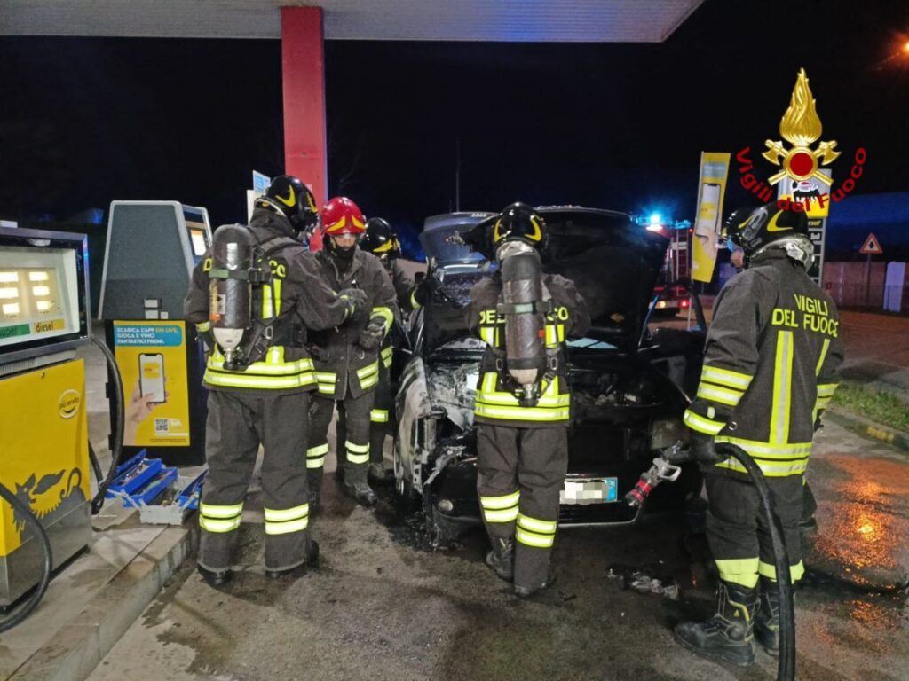 AZZANO DECIMO. Poco prima della mezzanotte i Vigili del Fuoco di Pordenone sono intervenuti per l'incendio di un'autovettura che per cause in corso di accertamento si accendeva mentre si stava rifornendo a un distributore di carburante.