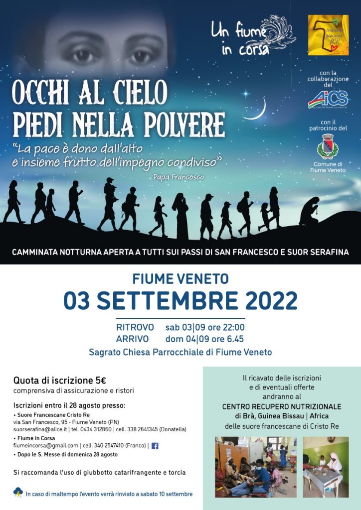 “Occhi al cielo e piedi nella polvere” è il titolo della manifestazione che si svolgerà il 3 settembre a Fiume Veneto (PN): una camminata notturna che abbraccia le località del Comune con un percorso ad anello, un cammino di condivisione e riflessione attraverso i luoghi in cui è nata e cresciuta suor Serafina Gregoris, in cui rimane ancora viva la sua memoria e si trasmette la forza del suo messaggio di consolazione e di speranza. A contatto con la natura, nel silenzio della notte, si sviluppa così un percorso comunitario ed interiore, articolato in tappe, con punti di ristoro e momenti per attingere alle radici storiche e spirituali che hanno nutrito il cammino di santità di suor Serafina.