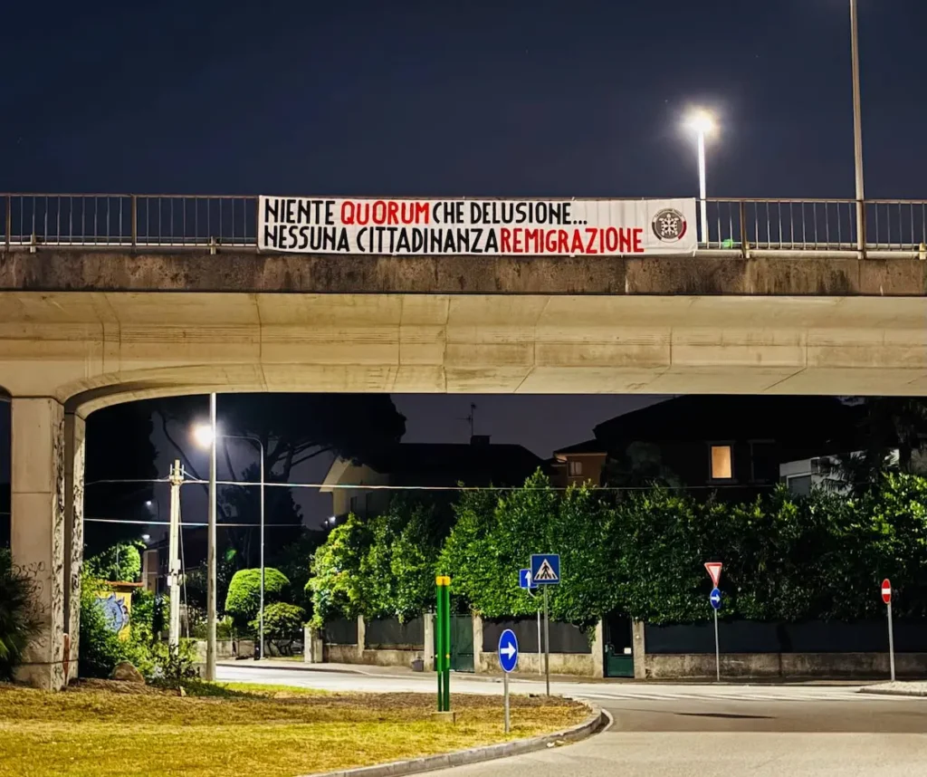 CasaPound affigge striscioni provocatori dopo il fallimento del referendum sulla cittadinanza. “Niente quorum, remigrazione”.