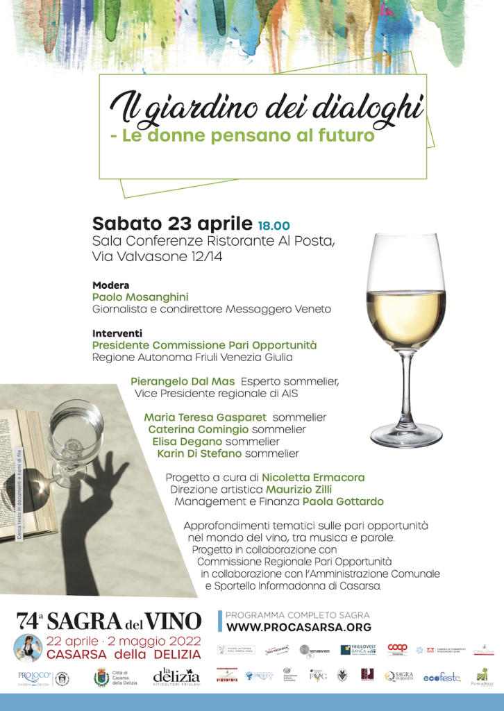 Moderati dal giornalista Paolo Mosanghini, interverranno la Presidente Commissione Pari Opportunità Regione Autonoma Friuli Venezia Giulia; le sommelier Maria Teresa Gasparet, Caterina Comingio ed Elisa Degano; il vicepresidente del Friuli Venezia Giulia dell'Associazione italiana sommelier Pierangelo Dal Mas.