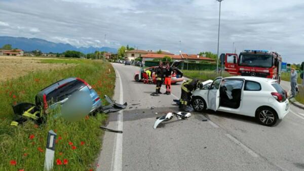 Incidente a Brugnera, due auto si scontrano, una si ribalta