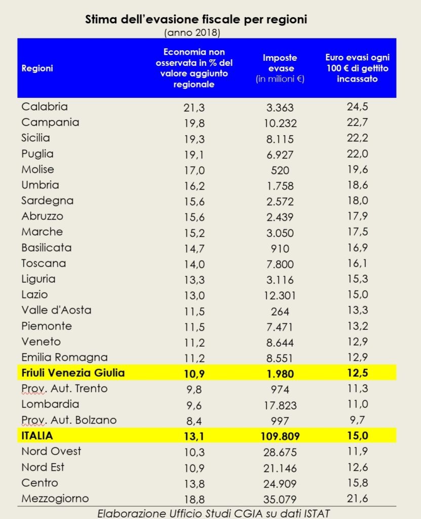 In attesa che si completi la tanto agognata riforma fiscale, l’Ufficio studi della CGIA ha stimato che nel 2018 (ultimo anno in cui i dati sono disponibili), l’evasione fiscale presente in Friuli Venezia Giulia (FVG) fosse di 1,9 miliardi di euro. In altre parole, per ogni 100 euro di gettito versato all’erario da cittadini e imprese della regione più a est del Paese, 12,5 sono “rimasti” nei portafogli degli evasori. Solo il Trentino Alto Adige e la Lombardia hanno registrato livelli di “infedeltà” fiscale inferiori. Insomma, in FVG l’evasione ha dimensioni molto contenute.