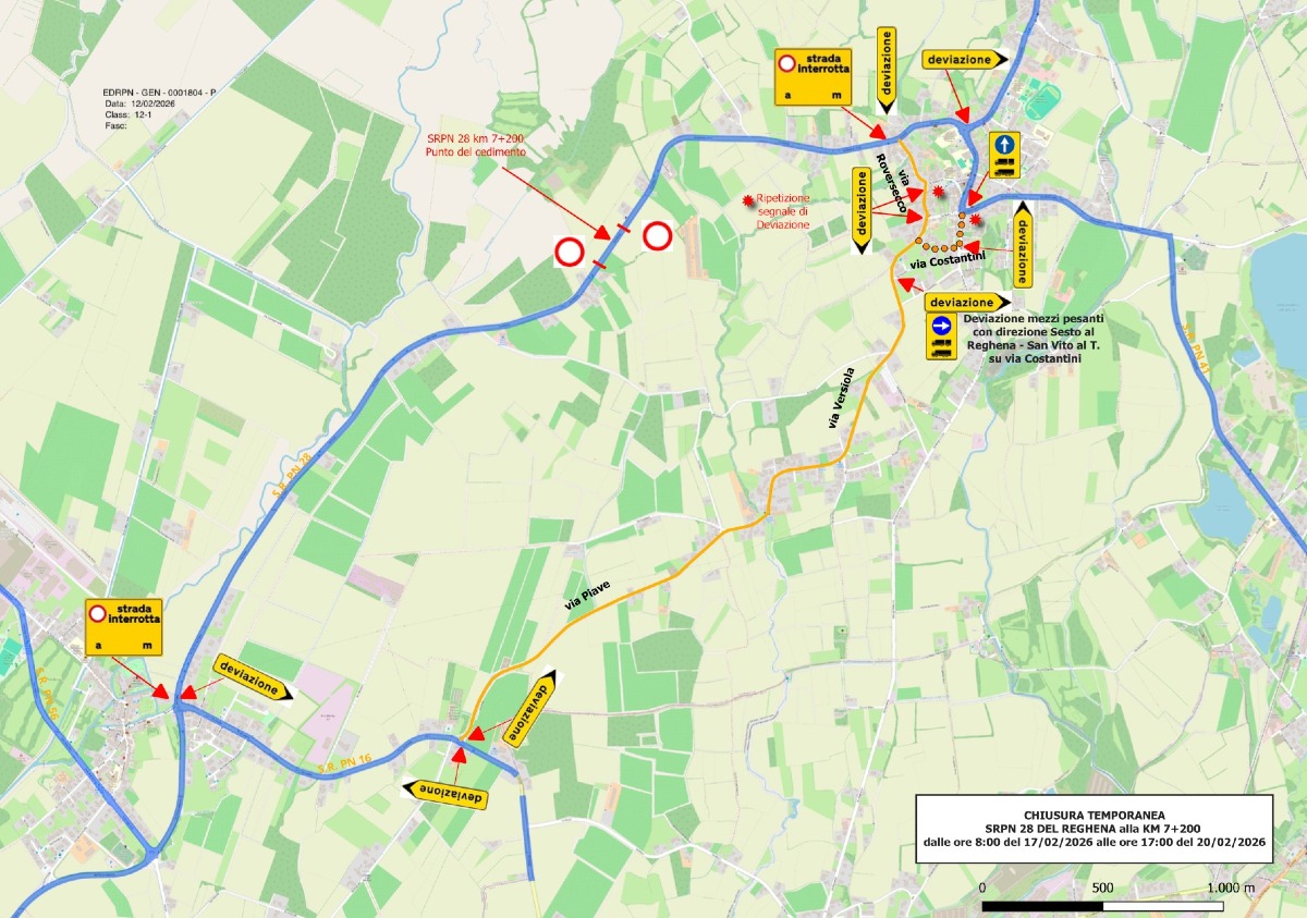 SESTO AL REGHENA (PN) – Stop alla circolazione sulla Strada regionale PN-28 tra Sesto al Reghena e Bagnarola. Il Comune ha ricevuto dall’Ente di Decentramento Regionale di Pordenone la comunicazione di sospensione del traffico dalle ore 8 di martedì 17 febbraio alle ore 17 di venerdì 20 febbraio.