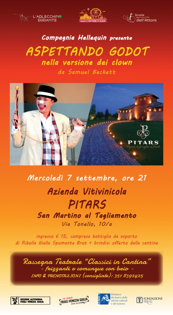 Sul palco, una divertente versione per clown del celebre Aspettando Godot di Samuel Beckett, uno dei più grandi testi del ’900 che, con la messa in scena della Hellequin, riuscirà a coinvolgere tutti, anche i più piccoli. La cantina Pitars è un “castello del vino”, un’architettura da favola immersa in un giardino circondato da filari di viti a perdita d’occhio che ospita rivendita dei vini, sala di degustazione e spazi per la convivialità e gli eventi.