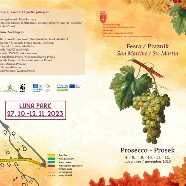 Anche quest'anno torna la Festa di San Martino a Proseccocon gli appuntamenti previsti a partire dalla giornata d’apertura di sabato 4 novembre con le escursioni per adulti e famiglie, i tornei di briscola, il concerti e la degustazione guidata del vino spumante Prosekar, nonché la “Martinova furenga” (domenica 5 novembre alle 14.30), ovvero il trasporto del vino nuovo con il carro trainato dai cavalli e ancora la mostra mercato (con una dozzina di realtà presenti) e tanto altro con convegni, approfondimenti e momenti di folclore.