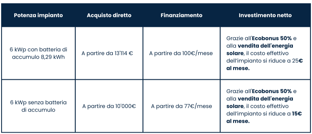 “Offrire ai clienti un impianto sufficiente ai propri consumi, con una rata più bassa della propria bolletta attuale, permette a chiunque di risparmiare fin dal primo giorno e non dopo aver ammortizzato l’intero costo dell’impianto o di un eventuale anticipo”