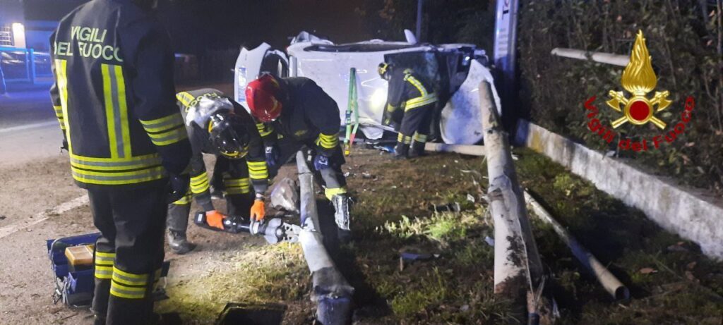 Dritti contro 2 pali con l'auto, li abbattono e si ribaltano: due feriti