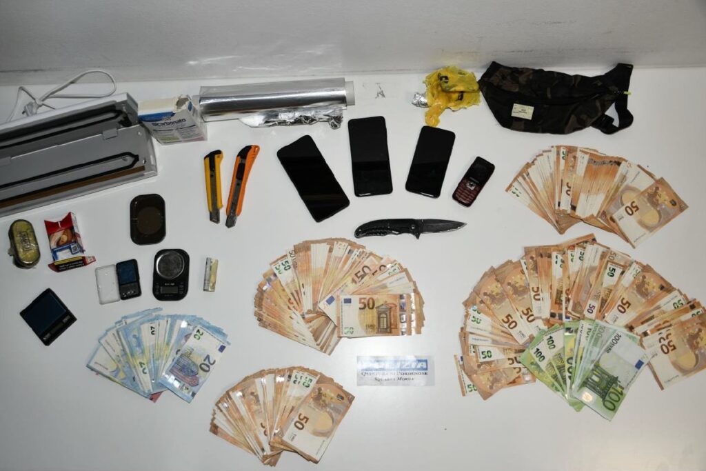 Gli Agenti della Squadra Mobile durante la perquisizione dell’indagato hanno rinvenuto 40 gr. di stupefacente del tipo cocaina e 62 gr. del tipo hashish, la somma di 20.000 euro in contanti e, all’interno dell’abitazione, materiale idoneo al confezionamento dello stupefacente.