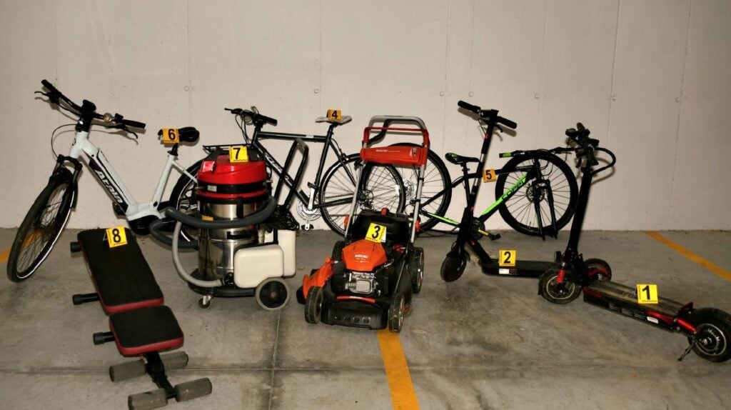 Nel garage dell’appartamento nella disponibilità dello stesso è stato rinvenuto materiale di presunta provenienza furtiva quale: due monopattini, una bicicletta elettrica, una bicicletta da strada, un rasaerba, un’idropulitrice, una panca da palestra ed altri oggetti.
