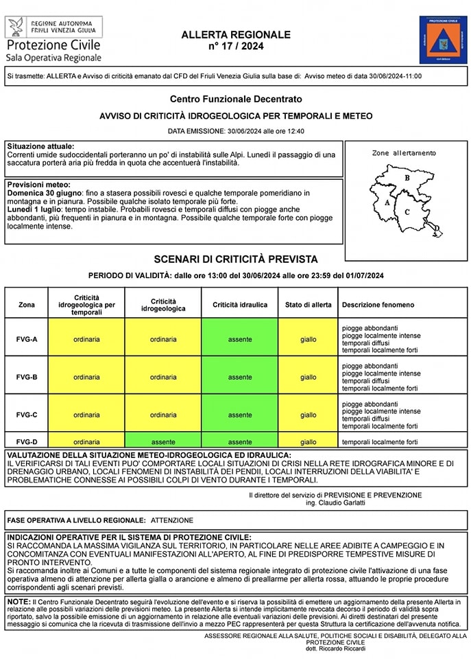 L'allerta sarà valida dalle ore 13:00 del 30 giugno 2024 fino alle ore 23:59 del 1 luglio 2024. Le zone di criticità sono suddivise come segue:
