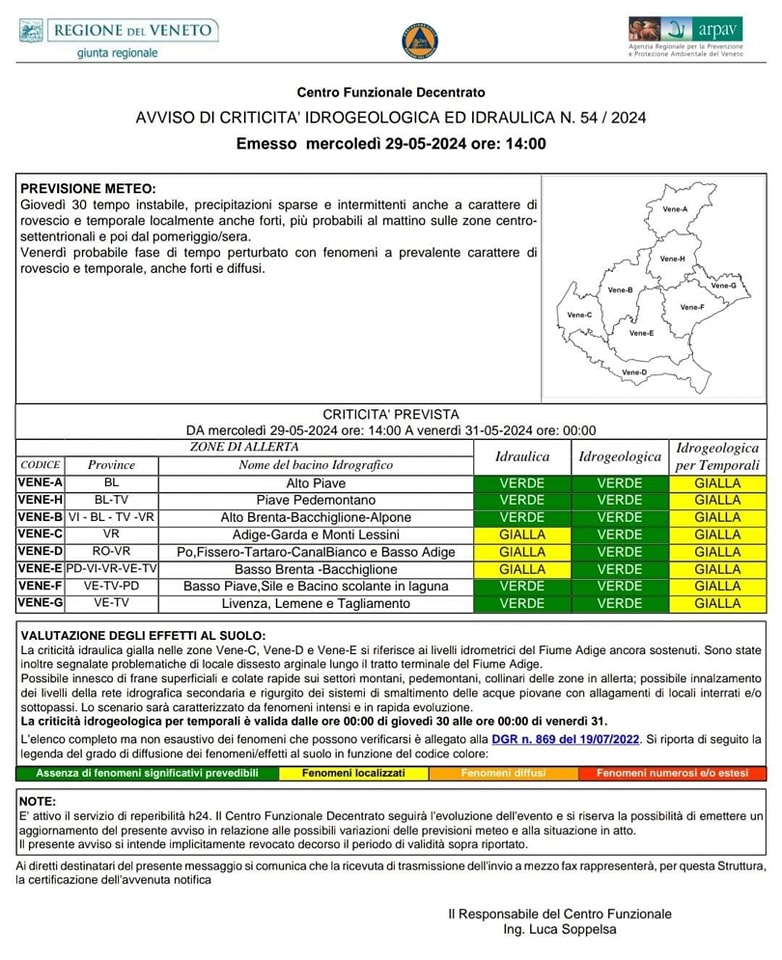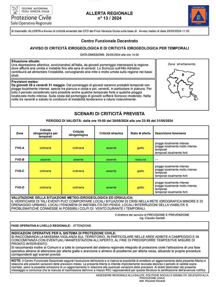 Il Centro Funzionale Decentrato del Friuli Venezia Giulia ha diramato un avviso di criticità idrogeologica e idraulica per temporali, valido dal 30 al 31 maggio 2024. Questo avviso è stato emesso in seguito all'analisi meteorologica che prevede l'avvicinamento di una depressione atlantica all'Italia. Questo sistema depressionario porterà aria umida e instabile sulla regione, soprattutto grazie al contributo dei venti di Scirocco sull'Alto Adriatico che convoglieranno aria mite e molto umida nei bassi strati. Anche in Veneto alle 14 di oggi è stata diramata una Allerta meteo.