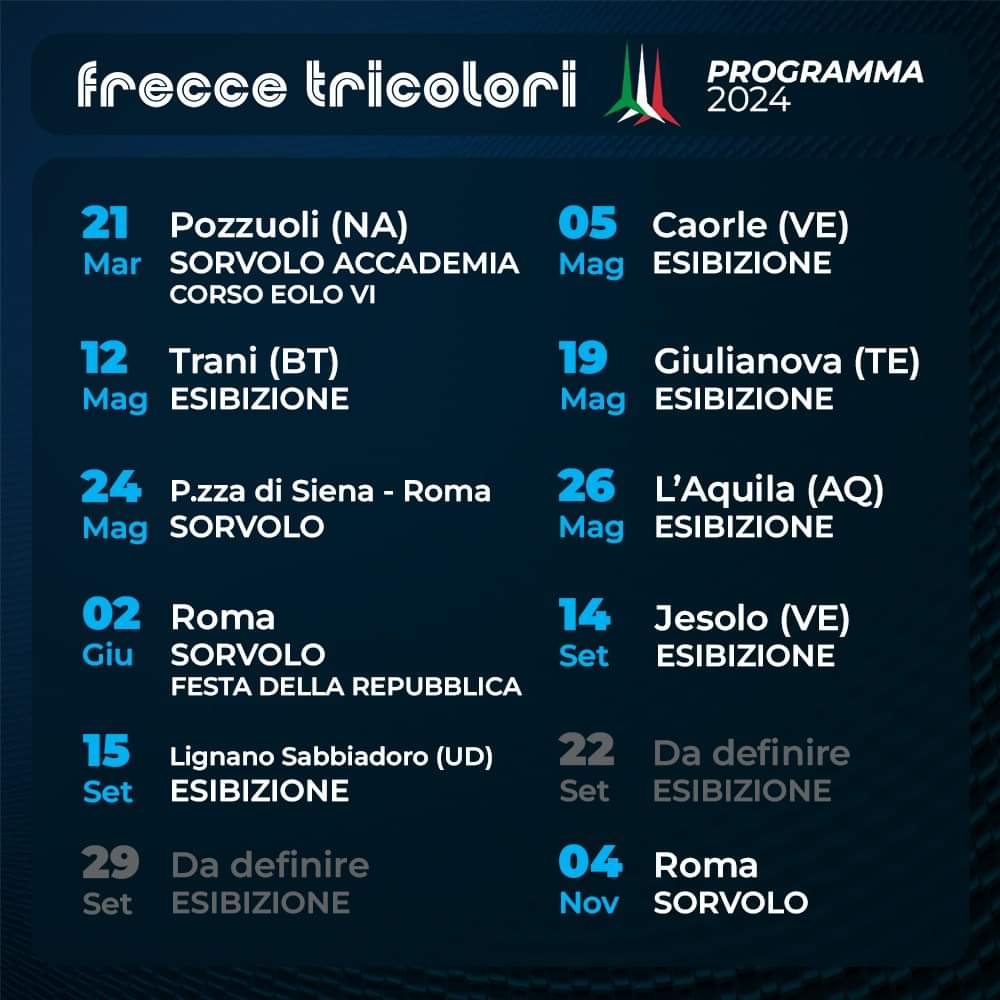 Il 2024 si preannuncia come un anno straordinario per tutti gli appassionati di aviazione e di spettacoli aerei, con le Frecce Tricolori pronte a dipingere il cielo di verde, bianco e rosso, i colori della bandiera italiana. La stagione delle esibizioni delle Frecce Tricolori, la Pattuglia Acrobatica Nazionale (PAN) dell'Aeronautica Militare Italiana, inizierà il 21 marzo a Pozzuoli, dando il via a un tour che toccherà diverse città italiane prima di concludersi il 4 novembre a Roma. A Nordest le Frecce sorvoleranno Lignano Sabbiadoro il 15 settembre, Caorle il 5 maggio e Jesolo il 14 settembre.