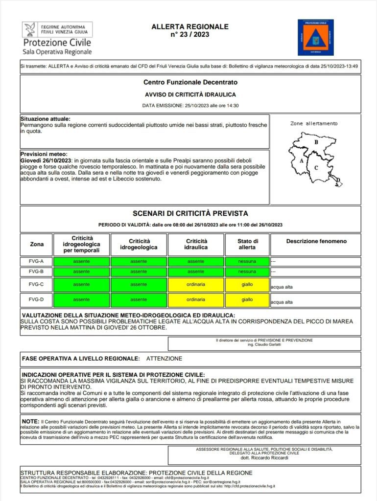 Il 25 ottobre 2023, la Regione Friuli Venezia Giulia ha annunciato l'ALLERTA REGIONALE 23, valida dalle ore 08:00 del 26/10 alle ore 11:00 dello stesso giorno. L'allerta riguarda specificamente la criticità idraulica costiera, con l'attenzione focalizzata su zone FVG-C e FVG-D.