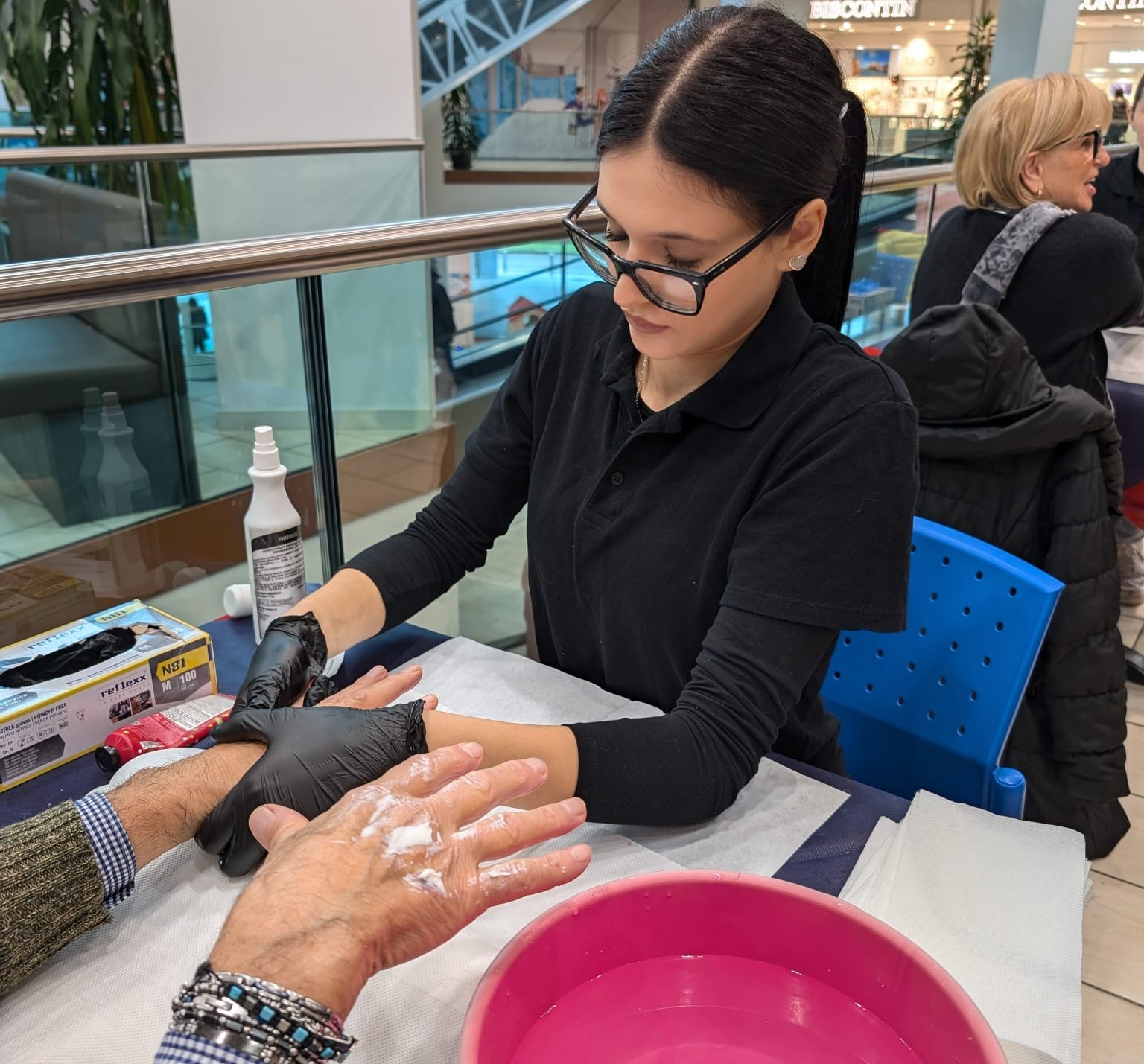 Le future estetiste dello IAL, tutte al primo anno di corso, si stanno cimentando in trattamenti di benessere per le mani. Nonostante siano ancora in fase di formazione, le allieve offrono gratuitamente trattamenti come scrub, massaggi e trattamenti personalizzati, regalando ai clienti un momento di relax e cura, in vista delle festività. Questa attività non solo consente agli studenti di acquisire esperienza diretta con i clienti, ma offre anche una pausa rigenerante per i frequentatori del centro commerciale.