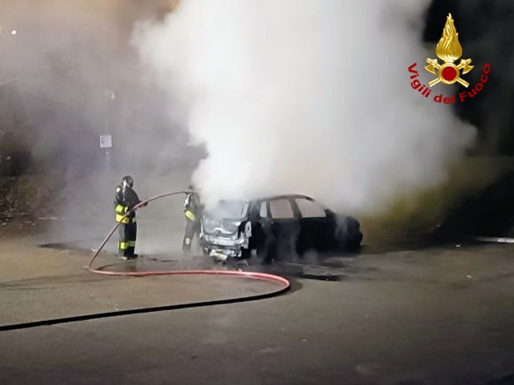 Auto a fuoco all'alba: vettura completamente avvolta dalle fiamme