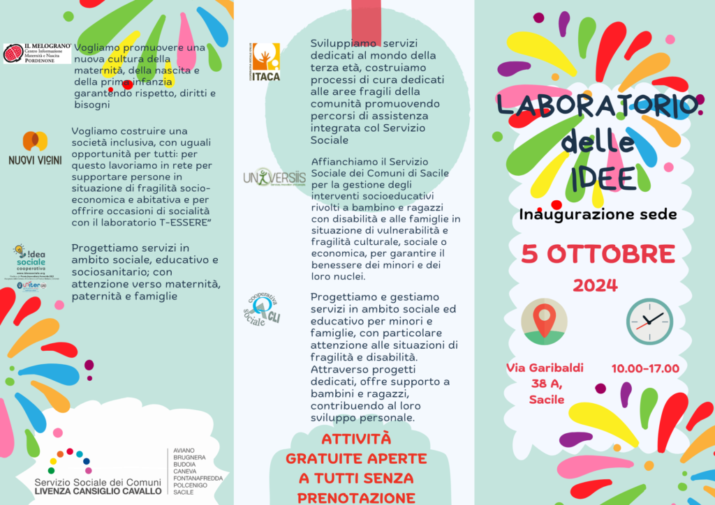 Il “Laboratorio delle idee” rappresenta un atto di cura a 360 gradi in un luogo nuovo e accogliente, dove il personale professionale sarà a disposizione per rispondere ai bisogni delle persone. Questa iniziativa è il frutto di una co-progettazione rivolta ai cittadini di Aviano, Brugnera, Budoia, Caneva, Fontanafredda, Polcenigo e Sacile, avviata con la regia del Servizio sociale dei Comuni Livenza Cansiglio Cavallo. Le sei Cooperative sociali – Acli, Idea, Itaca, Il Melograno, Nuovi vicini e Universiis – collaboreranno per offrire una serie di servizi, già presenti nei sette territori, all’interno di uno spazio fisico unico.