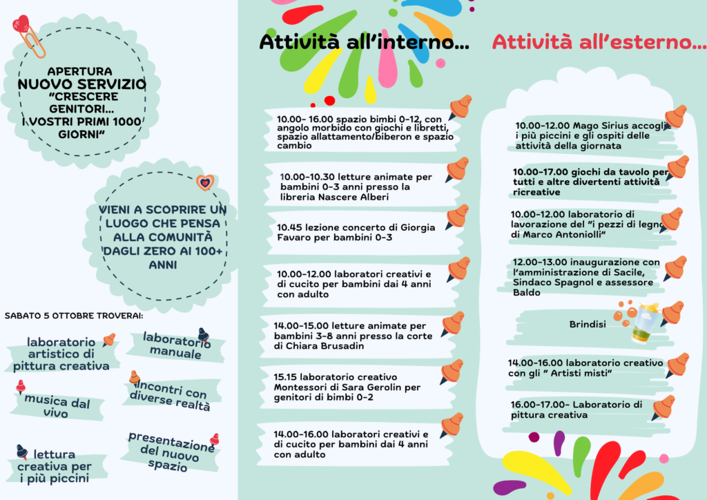 SACILE – Sarà inaugurato il 5 ottobre alle 10 a Sacile, in via Garibaldi 38 A, il “Laboratorio delle idee”, un nuovo spazio 0-100+ pensato per la comunità. Questa inaugurazione sarà accompagnata da una giornata interamente dedicata alle famiglie, in particolare a quelle con figli piccoli, con laboratori artistici, musica dal vivo e letture creative, tutte attività gratuite, oltre alla presentazione del nuovo servizio “Crescere genitori. I vostri primi 1000 giorni”.