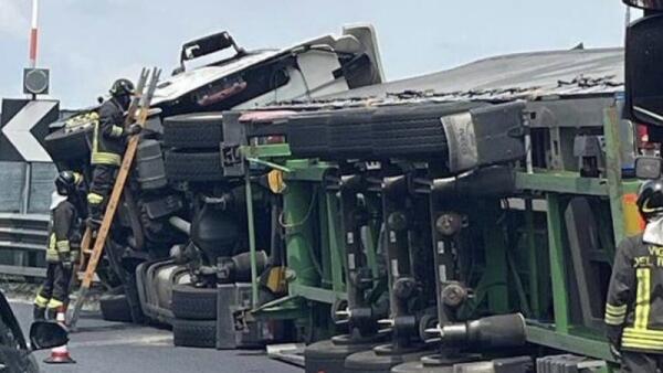 Scoppia un pneumatico, camion carico di uva si ribalta: tragedia sfiorata sull'A22
