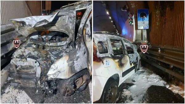 Auto si schianta sul guardail all'ingresso della galleria e prende fuoco: conducente se la dà a gambe