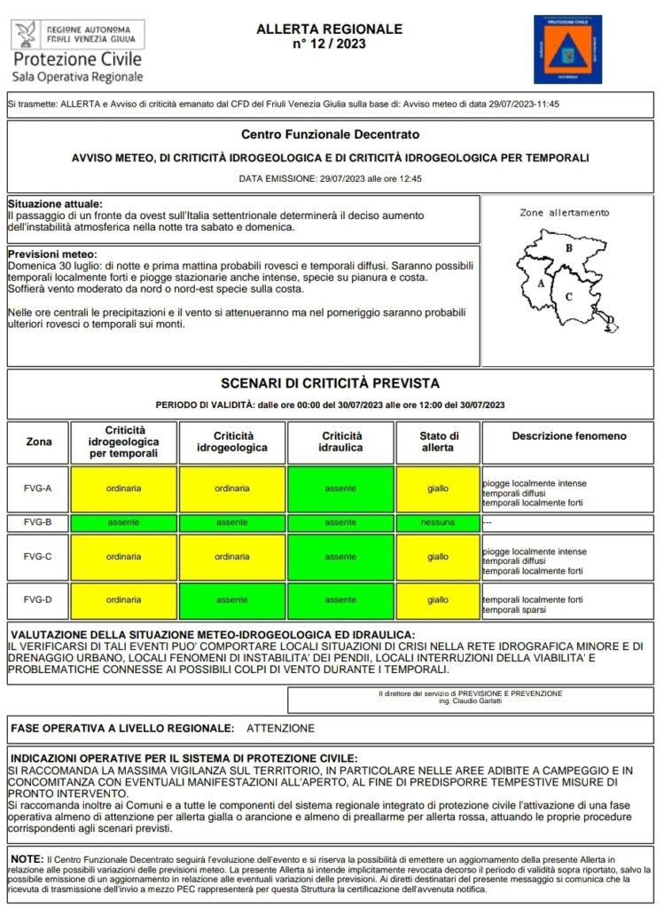 Da poco la Protezione Civile del Friuli Venezia Giulia ha diramato una allerta meteo considerate le previsioni con temporali anche forti dalla mezzanotte di oggi alle ore 12:00 di domani domenica 30 luglio 2023.