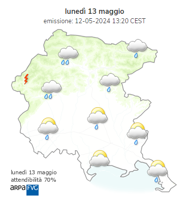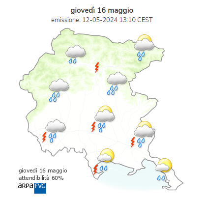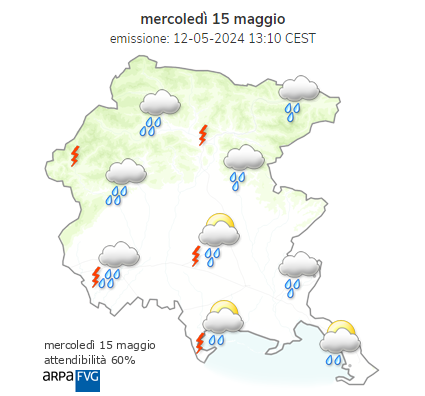 Prospettive future: Le condizioni meteo rimangono variabili con cielo da nuvoloso a coperto in pianura e montagna, e più variabile lungo la costa. Le precipitazioni saranno in intensificazione, specialmente sulla fascia prealpina, con possibili rovesci e temporali sparsi.