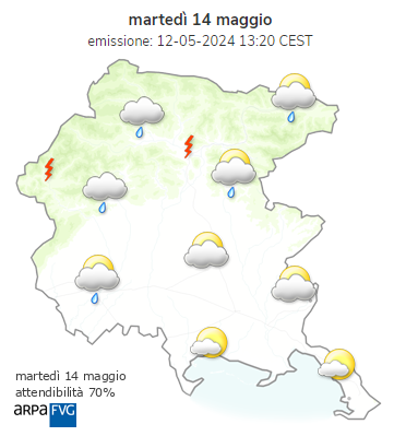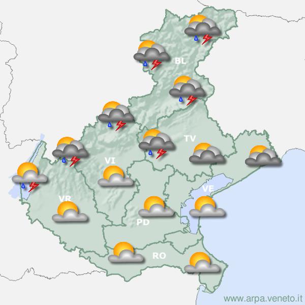 Il tempo sarà parzialmente nuvoloso, con tendenza a maggior nuvolosità sulle zone montane, in particolare quelle dolomitiche. Dalla notte si prevedono precipitazioni sparse anche a carattere di rovescio o temporale, mentre nelle altre aree le precipitazioni saranno generalmente assenti, salvo possibili fenomeni locali sulle zone nord-orientali al mattino. Il limite della neve si attesterà intorno ai 2500/2600 m. Le temperature minime saranno in aumento, mentre le massime subiranno un calo. I venti in quota si rinforzeranno da sud-ovest, mentre in pianura soffieranno deboli/moderati dai quadranti orientali, attenuandosi nel pomeriggio. Il mare si presenterà poco mosso.