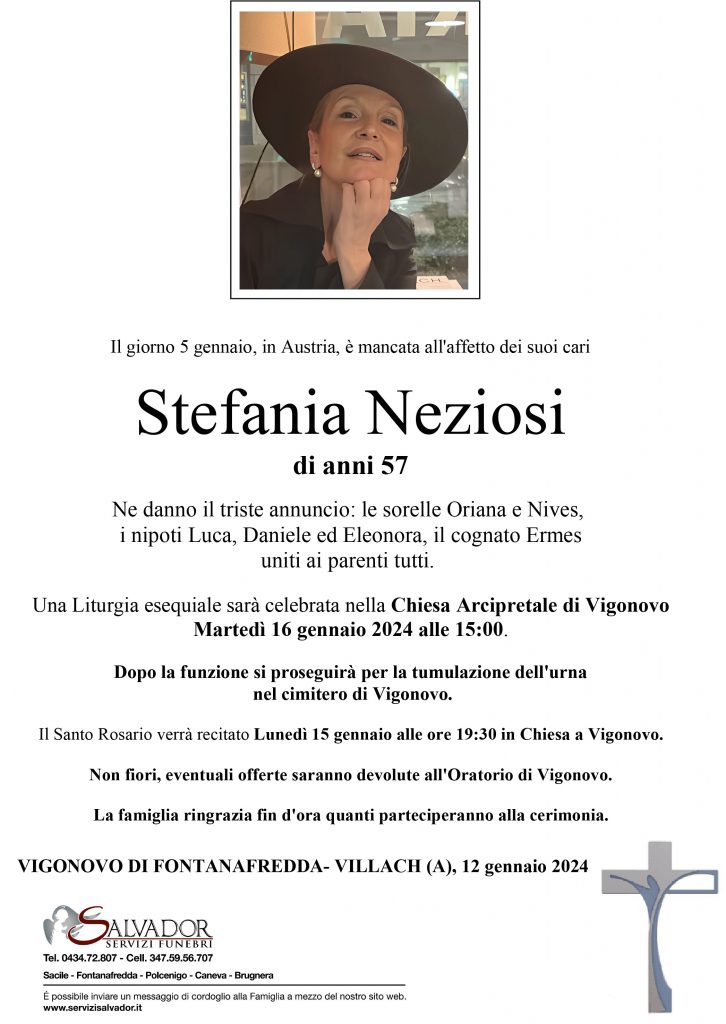La cerimonia funebre si terrà a Villach lunedì alle 12.30, come annunciato dalle sorelle Oriana e Nives. Il 16 gennaio, invece, la liturgia esequiale avrà luogo nella chiesa arcipretale a Vigonovo di Fontanafredda. Stefania Neziosi riposerà nel cimitero di Vigonovo, lasciando un vuoto incolmabile nel mondo del design e nel cuore di coloro che l'hanno conosciuta e ammirata.