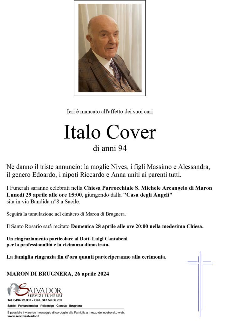 I funerali di Italo Cover si terranno lunedì 29 aprile alle 15 nella chiesa di Maron di Brugnera, dove amici, familiari e conoscenti avranno l'opportunità di salutare questo grande uomo, che con la sua vita ha tessuto la storia e il tessuto sociale della sua comunità.