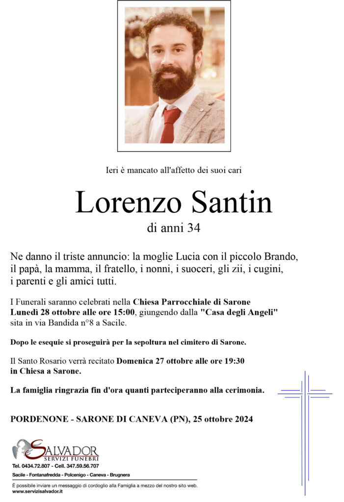 PORDENONE. È venuto a mancare nella mattinata di giovedì 24 ottobre, Lorenzo Santin, un medico di soli 34 anni che ha investito tutte le sue energie nella professione sanitaria ed aveva lavorato anche alla guardia medica del Policlinico San Giorgio di Pordenone. La sua morte è stata causata da una malattia che gli ha impedito di continuare a esercitare il lavoro che amava.