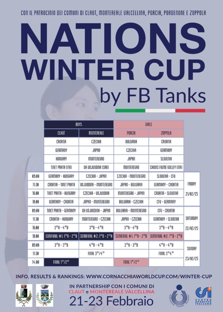 Dal 21 al 23 febbraio, i comuni di CLAUT e MONTEREALE VALCELLINA diventeranno i palcoscenici di un evento di grande prestigio per gli appassionati di pallavolo. I rispettivi palazzetti dello sport accoglieranno le partite delle squadre maschili under 16 della Nations Winter Cup, un torneo internazionale che promette di regalare emozioni forti e competizioni entusiasmanti.