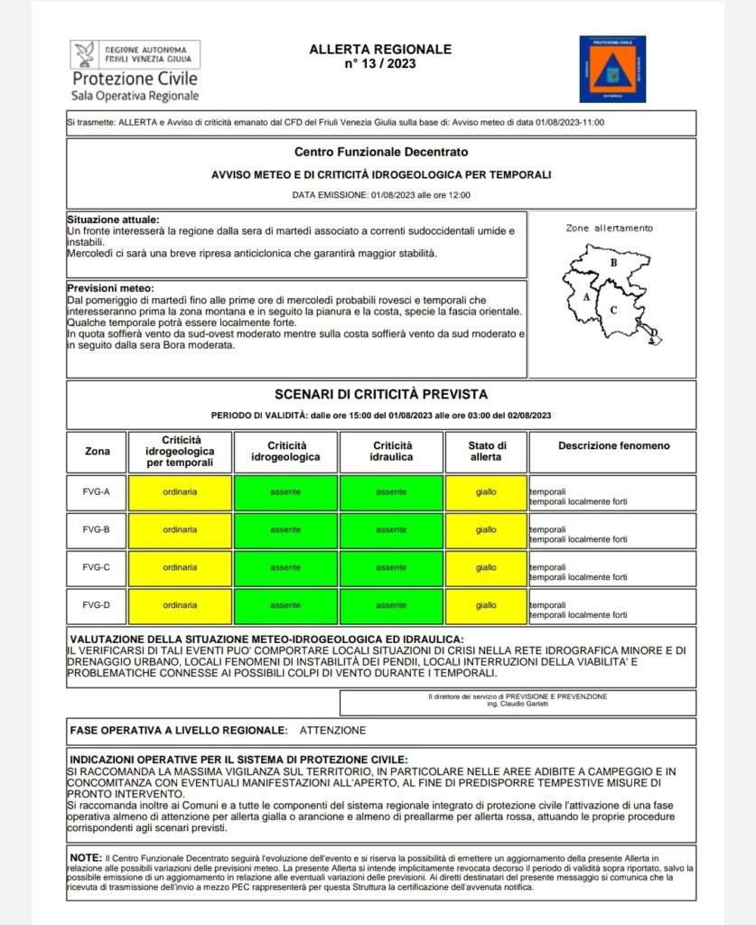 La Protezione Civile del Friuli Venezia Giulia ha diramato un'allerta meteo per le giornate di martedì 1 e mercoledì 2 agosto 2023. Si prevedono temporali forti con piogge anche intense e forti venti.