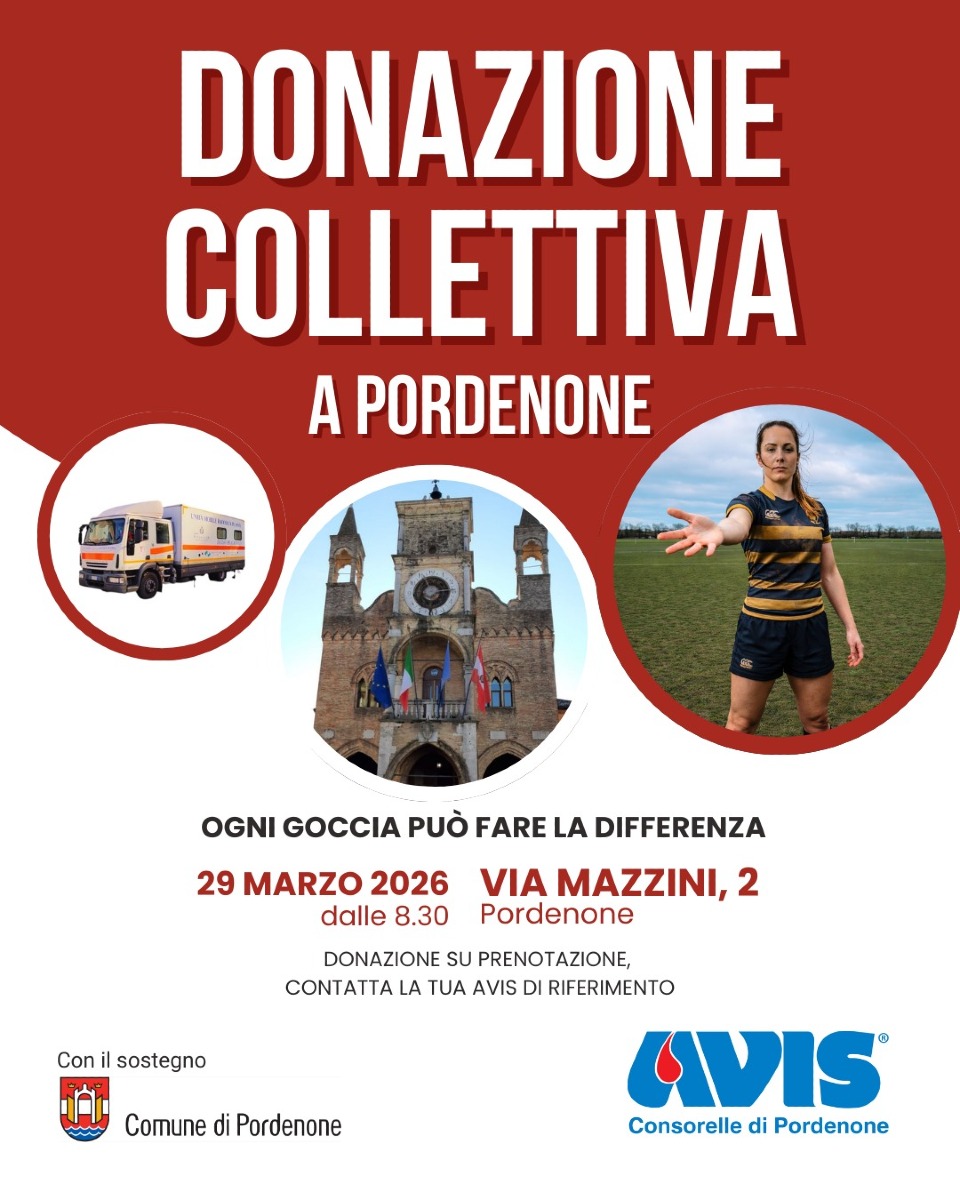 PORDENONE - Domenica 29 marzo il cuore di Pordenone si tingerà di solidarietà grazie a un’importante iniziativa promossa dalle AVIS di Pordenone: per la prima volta, infatti, le Comunali di Borgomeduna, Centro, Rorai Grande, Torre, Vallenoncello e Villanova uniranno le forze per una raccolta straordinaria con autoemoteca. L’evento si svolgerà in una posizione centrale e di grande visibilità, in piazzetta Cavour, trasformando uno dei luoghi più frequentati della città in una vera e propria vetrina di sensibilizzazione sul valore della donazione di sangue e plasma.