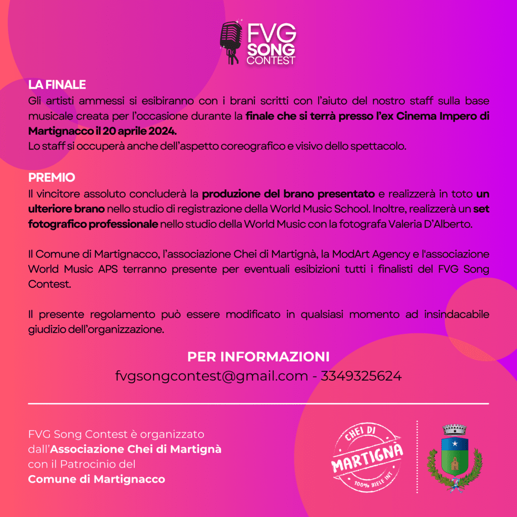 Il FVG Song Contest rappresenta un'occasione imperdibile per gli artisti emergenti del Friuli Venezia Giulia di fare il proprio ingresso nel mondo della musica, mettendo in luce il proprio talento e la propria originalità. Questo evento non solo celebrerà la musica e i suoi protagonisti ma contribuirà anche a valorizzare la scena musicale regionale, scoprendo e promuovendo i nuovi talenti che ne sono l'espressione.