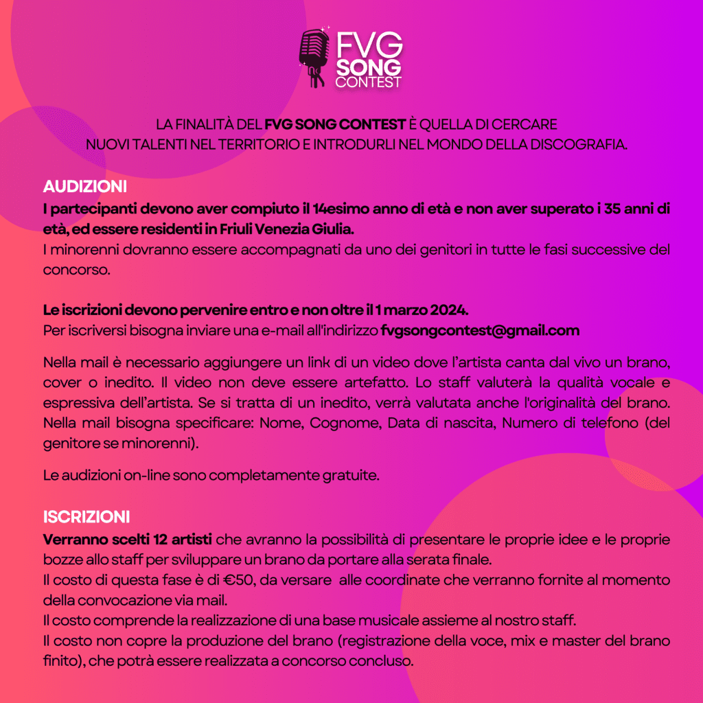 Il Friuli Venezia Giulia si prepara ad accogliere la prima edizione del FVG Song Contest, un'iniziativa che promette di diventare un appuntamento imperdibile per cantanti e gruppi musicali emergenti d...