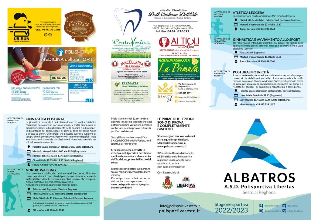 Dal 12 Settembre è ripartita la stagione sportiva della Libertas Albatros Sesto Reghena. Come di consueto l'associazione offre un’ampia varietà di attività sportive, che quest’anno sono oltre 20, per tutte le fasce d’età. Tra le novità c’è Kangoo Jumps, un allenamento ad alta intensità composto da ballo, corsa e salto che viene praticato con l'ausilio di un particolare paio di scarpe dotate di una molla attaccata alle suole e Total Training un mix esplosivo di TOTAL BODY, BODY SCULPT GAG, BODY WORK e FUNZIONALE rendendo così ogni lezione diversa.