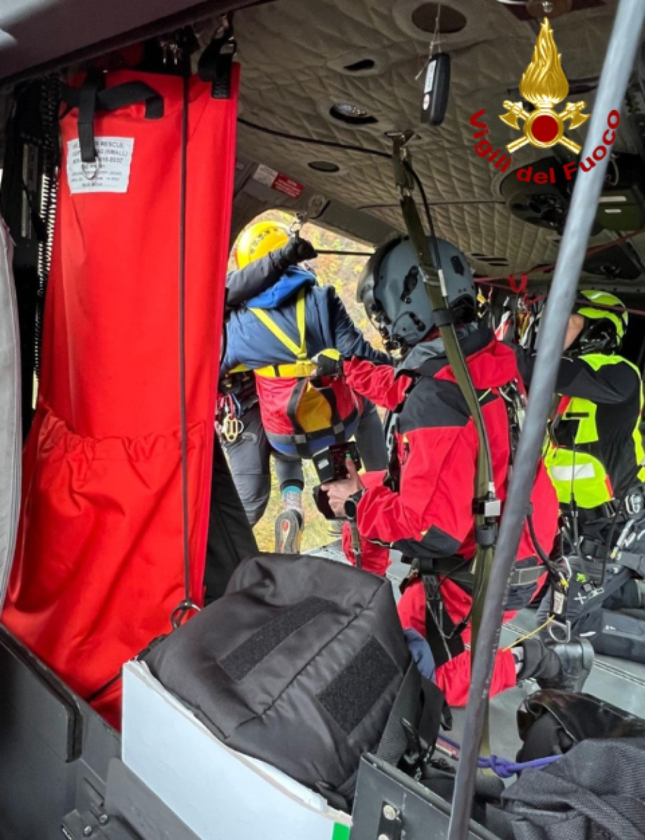 Ritrovato vivo dopo tre notti l’escursionista scomparso a Barcis: salvato dai Vigili del fuoco con l’elicottero Drago 149.