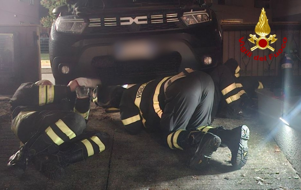 Azzano Decimo, 20 gennaio 2025: intervento dei Vigili del Fuoco per liberare un gatto incastrato nel vano motore di una vettura.