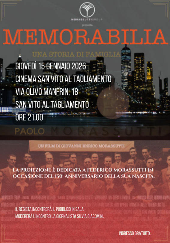 SAN VITO AL TAGLIAMENTO - Giovedì 15 gennaio 2026, alle ore 21.00, il Cinema San Vito ospita un evento cinematografico che scava nel profondo dell'identità: la proiezione speciale di “Memorabilia: Una Storia di Famiglia”. Il docufilm, firmato dal regista e attore Giovanni Enrico Morassutti, non è solo la cronaca di un’ascesa imprenditoriale, ma un’esplorazione profonda dell’anima dietro il marchio della storica ditta di ferramenta e casalinghi Paolo Morassutti. Al centro dell'opera non c'è solo la storia di un'impresa, ma il percorso autobiografico di Giovanni Enrico Morassutti, che firma la regia di un film nato dall'esigenza intima di ricomporre i frammenti della propria storia.