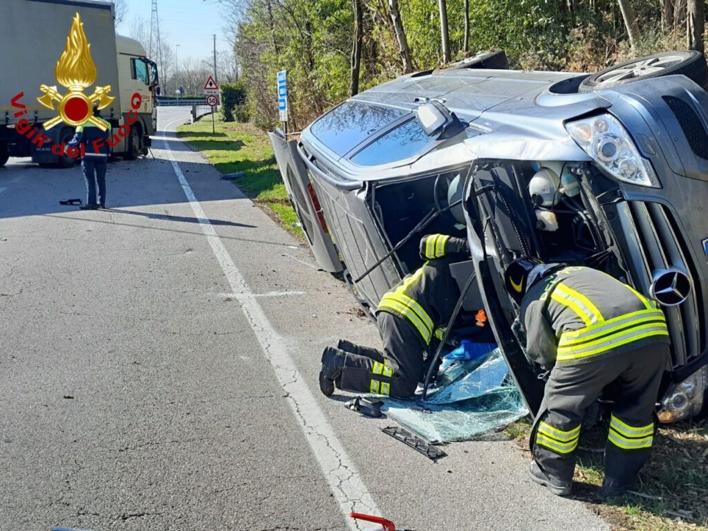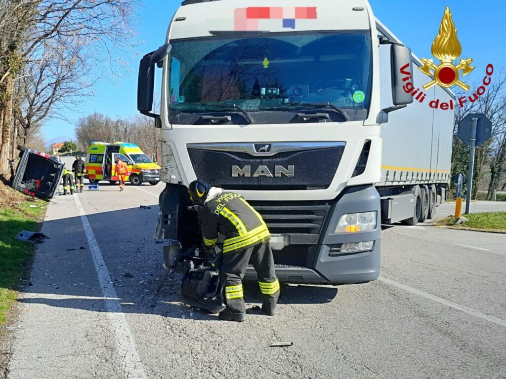 Spilimbergo. Violento scontro frontale con un camion, l'auto si ribalta