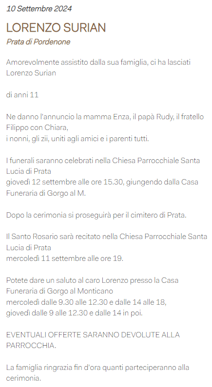 PRATA è in lutto per la tragica scomparsa di Lorenzo Surian, un bambino di soli 11 anni che ha perso la vita dopo quattro giorni di agonia. La notizia è stata diffusa dalla sindaca Katia Cescon tramit...