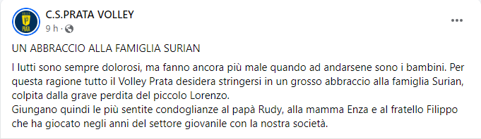 In questi momenti di dolore, la comunità di Prata si è unita per mostrare il proprio sostegno alla famiglia Surian. Oltre alla vicinanza fisica, molti hanno espresso il loro cordoglio attraverso i social media. Anche il Volley C.S. Prata ha voluto esprimere le sue condoglianze: «I lutti sono sempre dolorosi, ma fanno ancora più male quando ad andarsene sono i bambini. Per questa ragione tutto il Volley Prata desidera stringersi in un grosso abbraccio alla famiglia Surian, colpita dalla grave perdita del piccolo Lorenzo». Il messaggio pubblicato su Facebook è stato un'espressione sentita di solidarietà verso il papà Rudy, la mamma Enza e il fratello Filippo, che ha giocato nel settore giovanile della società.