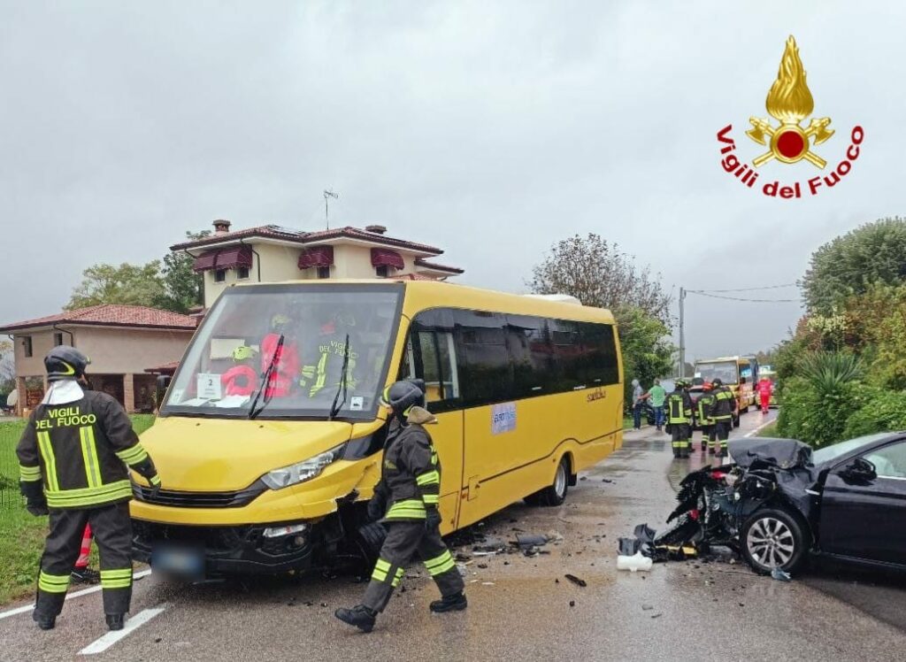 PASIANO DI PORDENONE. Poco prima delle ore 14:00 di oggi 24 ottobre 2023 i Vigili del Fuoco di Pordenone sono intervenuti per un incidente stradale fra un'autovettura ed uno scuolabus che, per cause in corso di accertamento, si sono scontrati frontalmente.