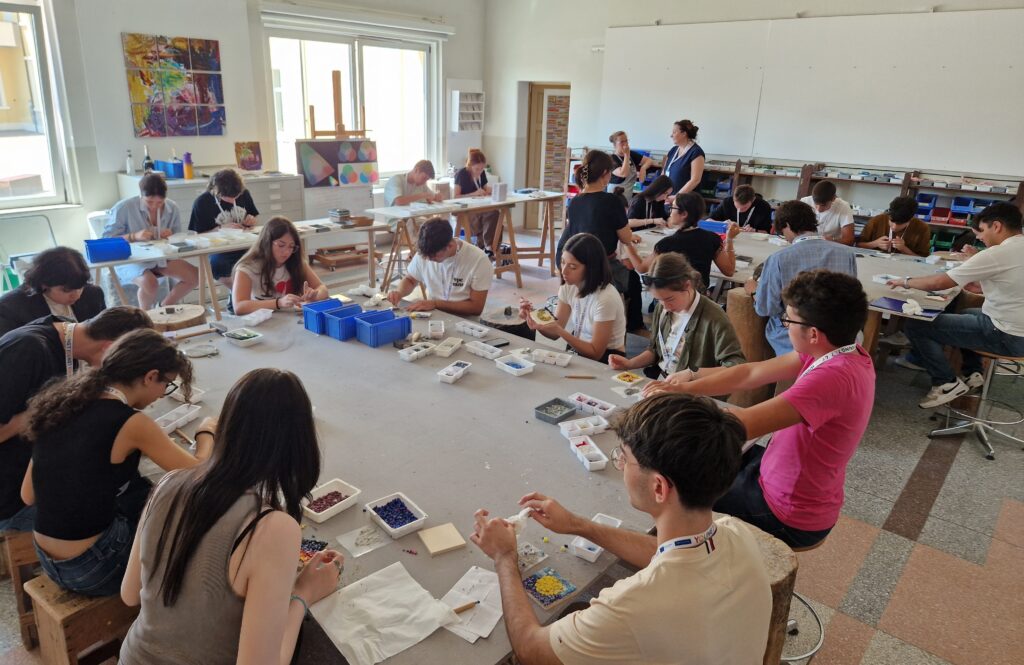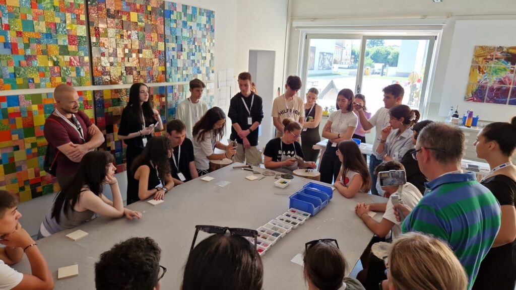Una delegazione del YounG7, 24 studenti, accompagnati da docenti e formatori, ha dunque visitato la Scuola Mosaicisti del Friuli e partecipato a un workshop toccando i materiali, tagliando e incollando le tessere, realizzando ciascuno una piccola opera che è il risultato del contatto e dell’esperienza diretta con l’arte del mosaico.